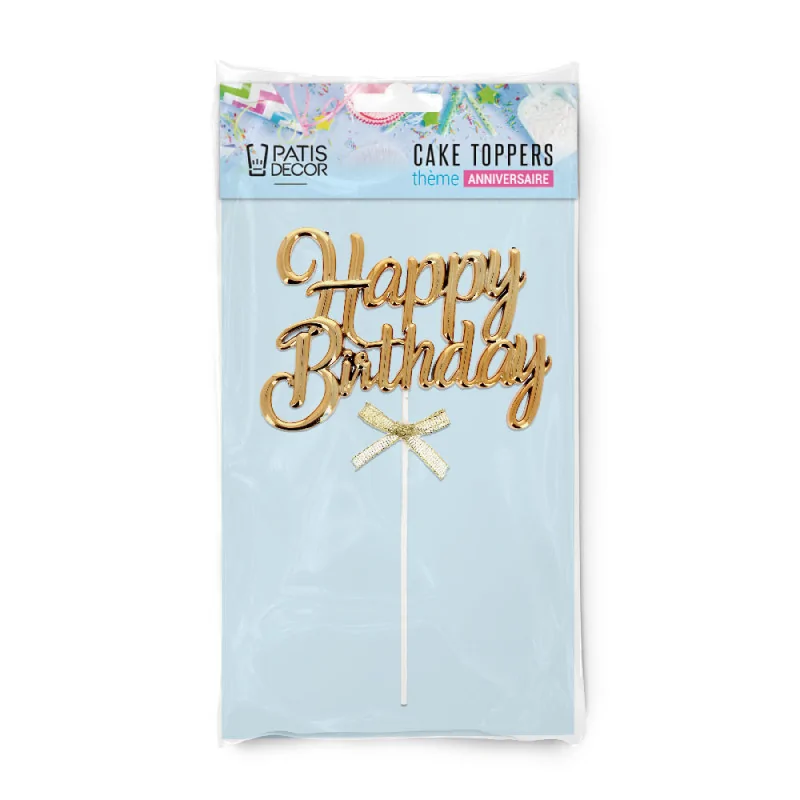 Cake topper doré sur le thème anniversaire, il représente une écriture "Happy birthday" dorée avec un ruban en dessous.