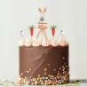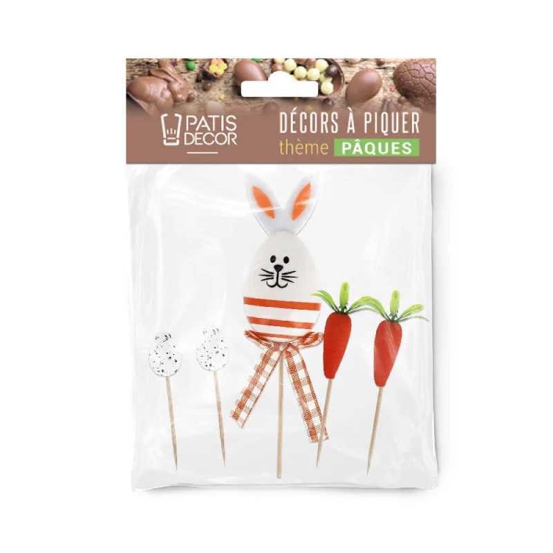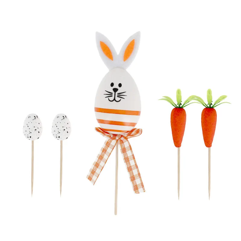 Lot de 5 cakes toppers sur le thème de Pâques, le lot contient les motifs suivants : un œuf de Pâques lapin avec un ruban, deux carottes et deux œufs blancs.