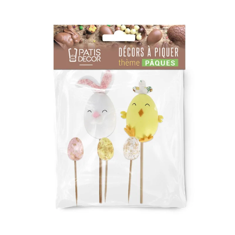 Lot de 5 cakes toppers sur le thème de Pâques, le lot contient les motifs suivants : un œuf de Pâques lapin, un œuf poussin, un petit œuf rose pailleté doré, un blanc et un jaune