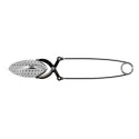 Diffuseur à thé ovale, d'une longueur d'environ 5 cm et d'une hauteur d'environ 2 cm. Pour l'ouvrir, il suffit d'exercer une légère pression sur la poignée.