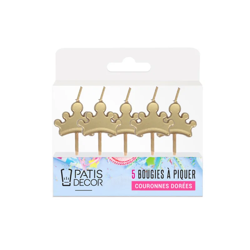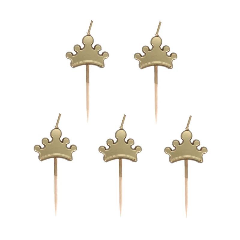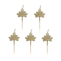 5 bougies dorées en forme de couronnes à piquer dans un gâteau.