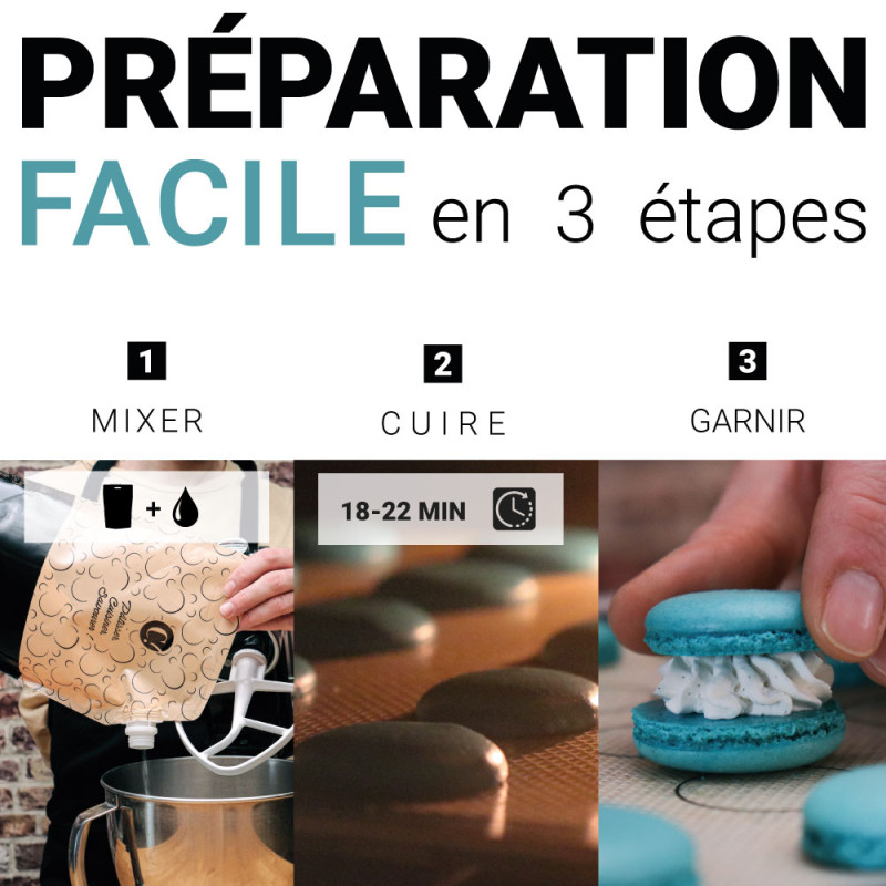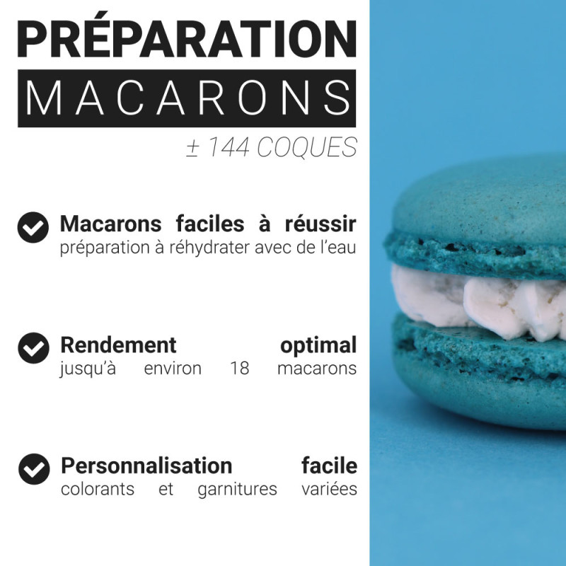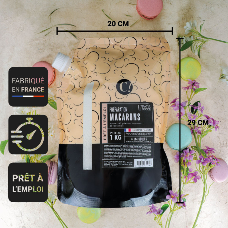 Référence : P2077Préparation à réhydrater 1 kg pour coques de macarons. Idéale pour réussir facilement des macarons maison lisses, ronds et réguliers.