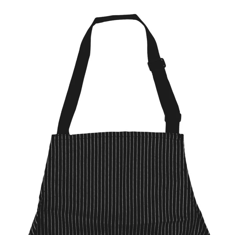 Ce tablier rayé noir et blanc utilise une sangle réglable sur l'encolure.