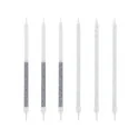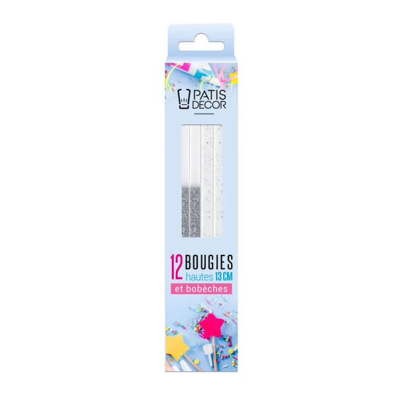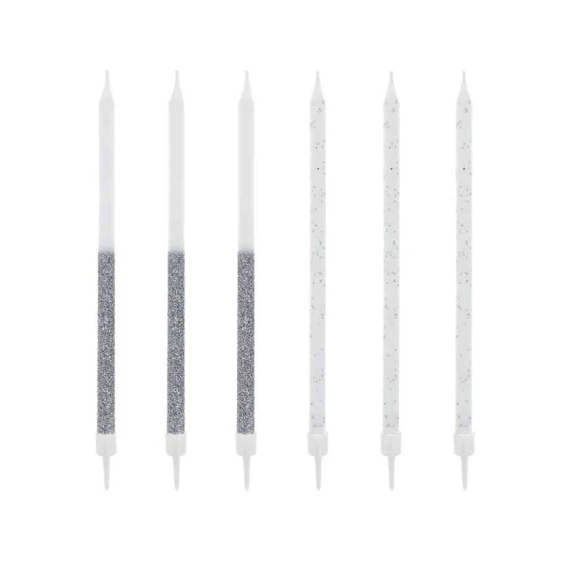 Lot de 12 bougies hautes à paillettes bicolores argentées avec bobèches.