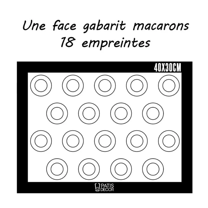 - Une face de la toile possède un marquage qui permet de réaliser 18 macarons ou choux et l'autre face un marquage pour réaliser 12 éclairs.