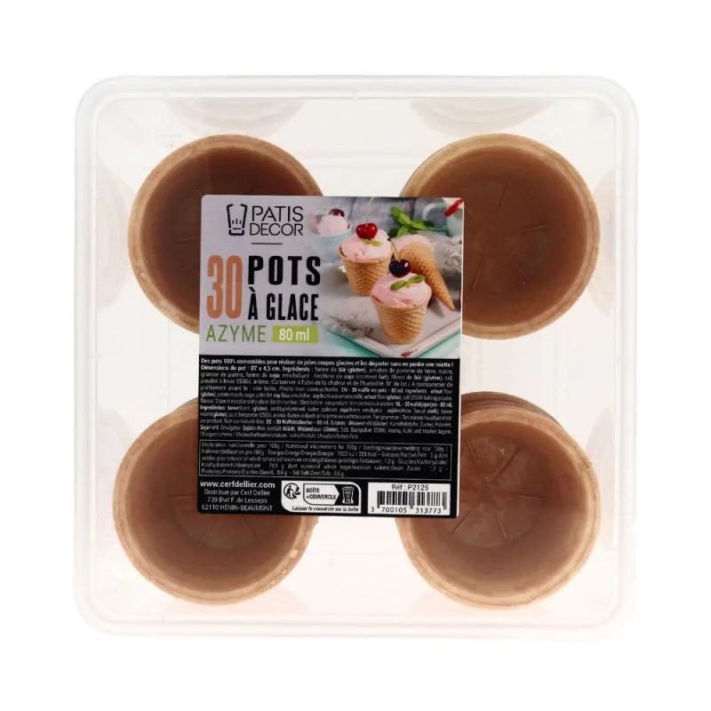 Lot de 30 pots à glace azymes Patisdécor, contenance 80 ml. Idéal pour servir vos glaces maison ou professionnelles avec croustillant et élégance.