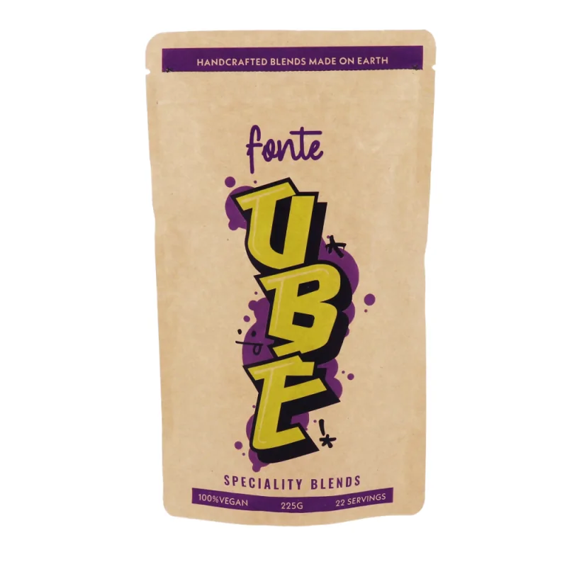 Poche de 225g de préparation pour ube latte en poudre. Ingrédients naturels et vegan.