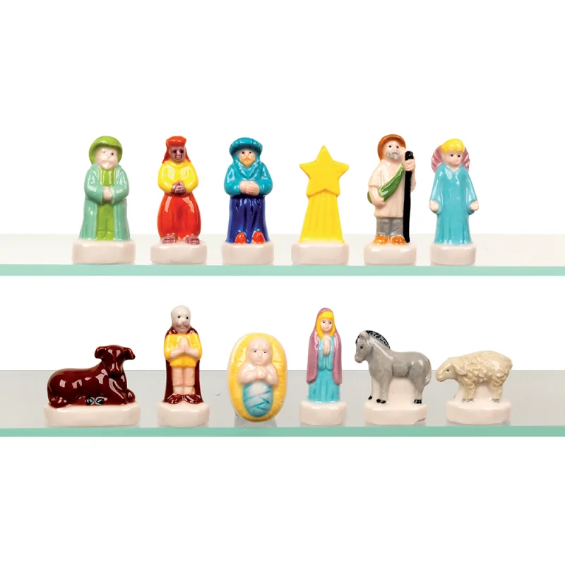 Lot de 100 fèves Santons, comprenant 12 modèles différents représentant les personnages traditionnels de la crèche. Fèves en porcelaine alimentaire, idéales pour galettes des rois, animations ou collection.
