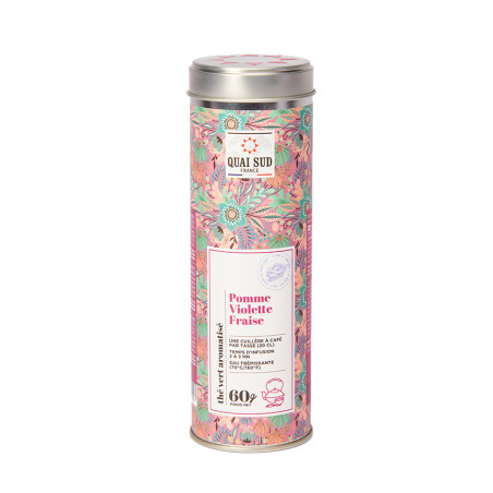 Succombez au Thé Vert Joy, une création aromatique signée Quai Sud. Ce thé vert aromatisé associe la fraîcheur naturelle du thé vert à la douceur fruitée de la pomme et de la cerise, relevée par la délicatesse florale de la violette. Une infusion légère et joyeuse, parfaite pour vos pauses cocooning, vos instants fleuris ou vos moments de détente.