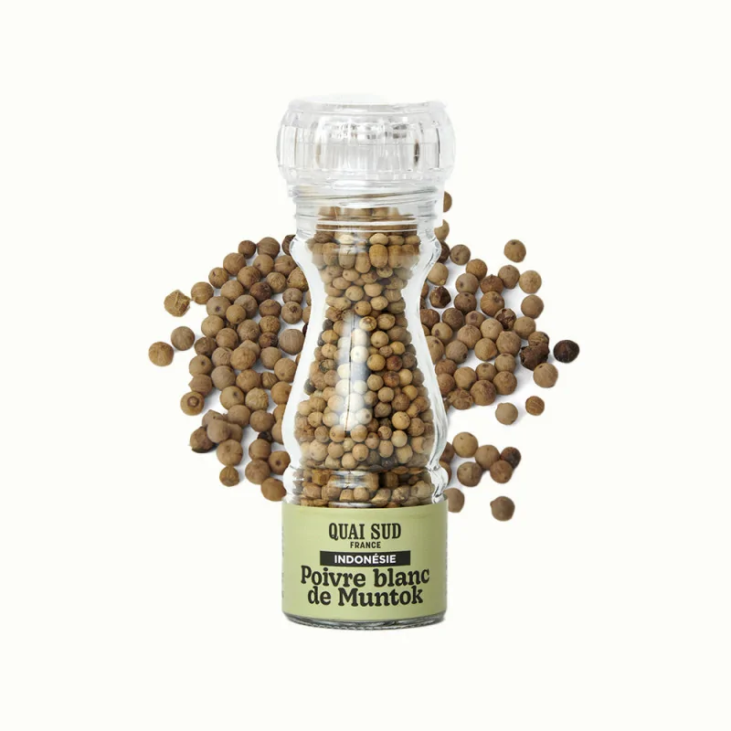 Éveillez vos papilles avec le Poivre Blanc de Muntok, aux grains crème, doux et parfumés. Parfait pour sublimer poissons, volailles, potages et même le melon.