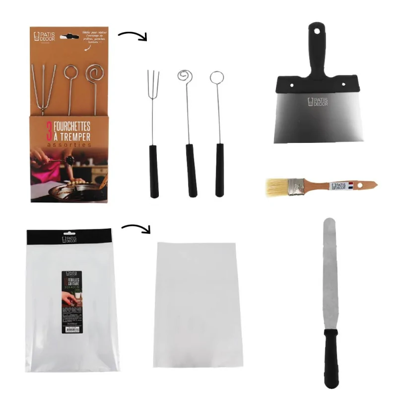 Kit complet pour chocolatier, idéal pour lisser, travailler et décorer vos créations comme un professionnel. Ce lot inclut une spatule coudée 20 cm, une spatule à chocolat 18 cm, un pinceau plat en soie naturelle, 3 fourchettes à tremper et 10 feuilles guitare 30x40 cm. Conçus en matériaux de qualité (acier inoxydable, bois, plastique rigide, polyéthylène), ces outils offrent précision, confort et durabilité. Parfaits pour le travail du chocolat tempéré, les glaçages, les nappages et la création de décors raffinés. Exclusivement sur Internet