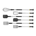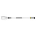 Gamme ergonomique. Ameliore le confort des opérateurs, réduit la pénibilité et limite les risques de TMS Position du corps de l\'outil verticale et adaptée. Le poignet reste dans l\'alignement de l\'avant-bras Plusieurs prises en main possibles pour une meilleure gestion de l\'effort Légèreté de l\'outil diminue la fatigue Outil suspendu par son pommeau. Support code 111205 Poignée pagaie Exoglass® munie d\'une butée pour maximiser la restitution de l\'effort. Poignée intermédiaire pour éviter le contact avec la chaleur ou le froid du tube métallique. Résiste à 220°C Fixation renforcée des poignées pour éviter la casse Tube oblong en acier inoxydable évite le roulement sur les bords des cuves Choqueur en tête d\'outil pour limiter le bruit, les vibrations et protéger les bords de cuves Palette inox conçue pour racler efficacement le fond des cuves Dimensions de la palette : 230 mm Largeur palette : 140 mm