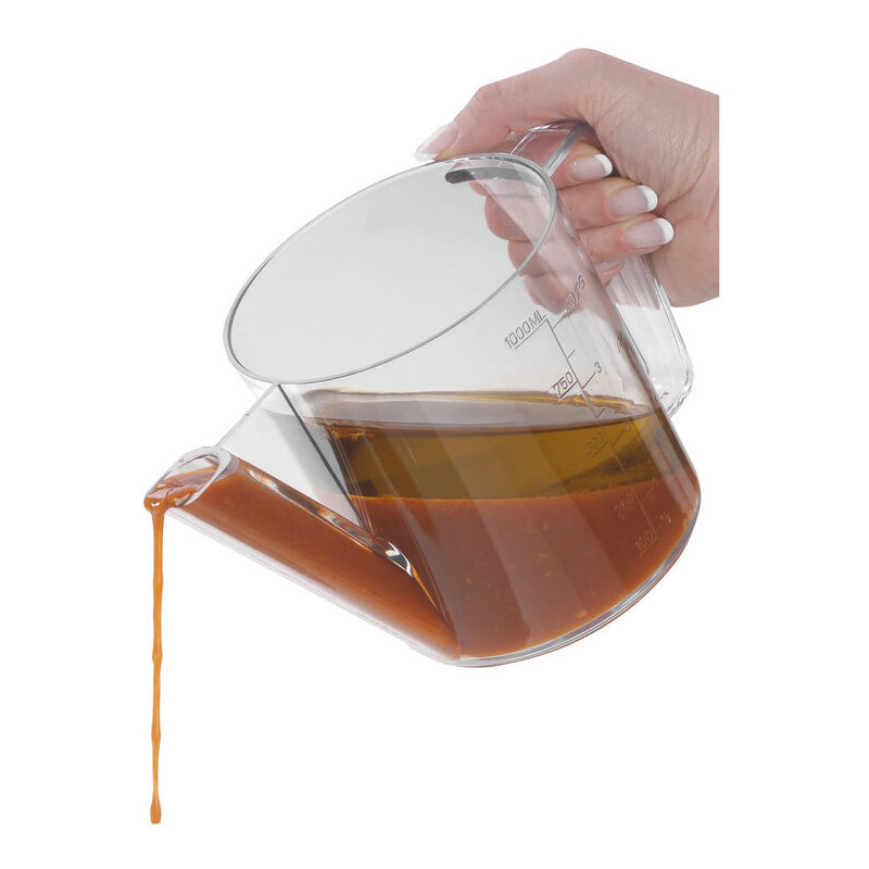 Idéal pour séparer la graisse de vos sauces par décantation Le bec verseur relié à la base permet de récupérer directement la sauce Pratique le broc est gradué en SAN Très résistant et bonne durée de vie Facile d\'entretien et à nettoyer Graduations : 100,250,500,750,1000ml et 1/4, 1/2, 3/4, 1L