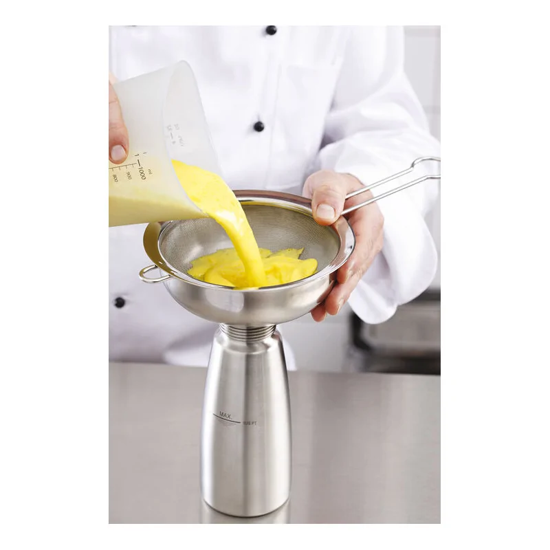 Entonnoir avec tamis en acier inoxydable Permet de filtrer votre préparation avant de la passer au siphon Goulotte large 32cm spécialement adaptée au col des siphons Accessoire incontournable pour réussir ses chantilly et espumas Positionnement stable sur le siphon
