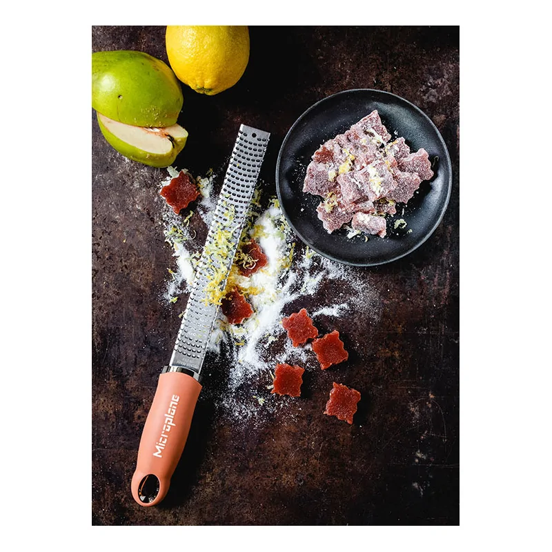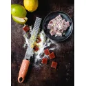 Idéale pour râper sans effort les agrumes, les fromages durs, le gingembre, les champignons, le chocolat... Râpe à lame longue durée, à coupe rasoir, en acier inoxydable Aliment coupé sans êtres déchiqueté: arômes et saveurs préservés Manche ergonomique toucher velours et embout en caoutchouc anti-éraflures à l\'extrémité de la râpe Oeillet de suspension Livré avec un étui protecteur pour la râpe Lavage de l\'étui à la main A épuisement du stock , la couleur de la râpe pourra changer légèrement en cours d\'année
