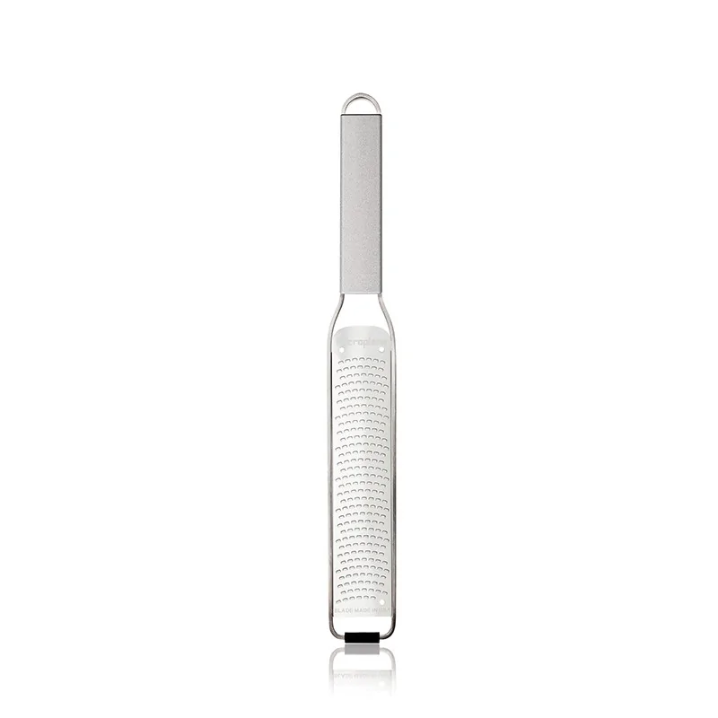 Idéale pour râper finement et sans effort tous les ingrédients : zestes, fromages, gingembre, chocolat, etc Lames en acier inoxydable ultra-affûtées et de longue-durée, fabriquées par photochimie Les aliments sont coupés précisément, sans être déchiquetés ni écrasés Les arômes naturels et les saveurs sont libérés et préservés Râpe équipée d\'un manche solide en acier inoxydable Oeillet de suspension