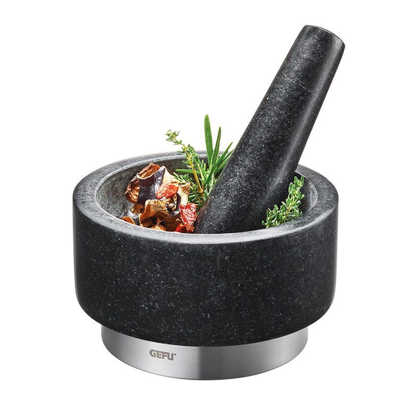 Pour broyer les épices et les aromates Fond arrondi et base de pilon rugueux pour un résultat optimisé Base en acier inoxydable assurant une grande stabilité