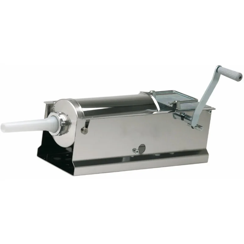 Idéal pour réaliser manuellement des saucisses avec tous types de farces et chairs Poussoir à saucisses horizontal, contenance 5kg Cylindre en acier inoxydable 18/10 Piston en nylon avec joint torique Mécanisme et engrenages en aluminium Socle en acier inoxydable Manivelle amovible permettant d\'actionner une crémaillère à 2 vitesses: 1 lente pour le poussage et 1 rapide pour le retour du piston Livré avec 4 cornets de diamètre 11 mm, 18 mm, 25 mm et 33 mm
