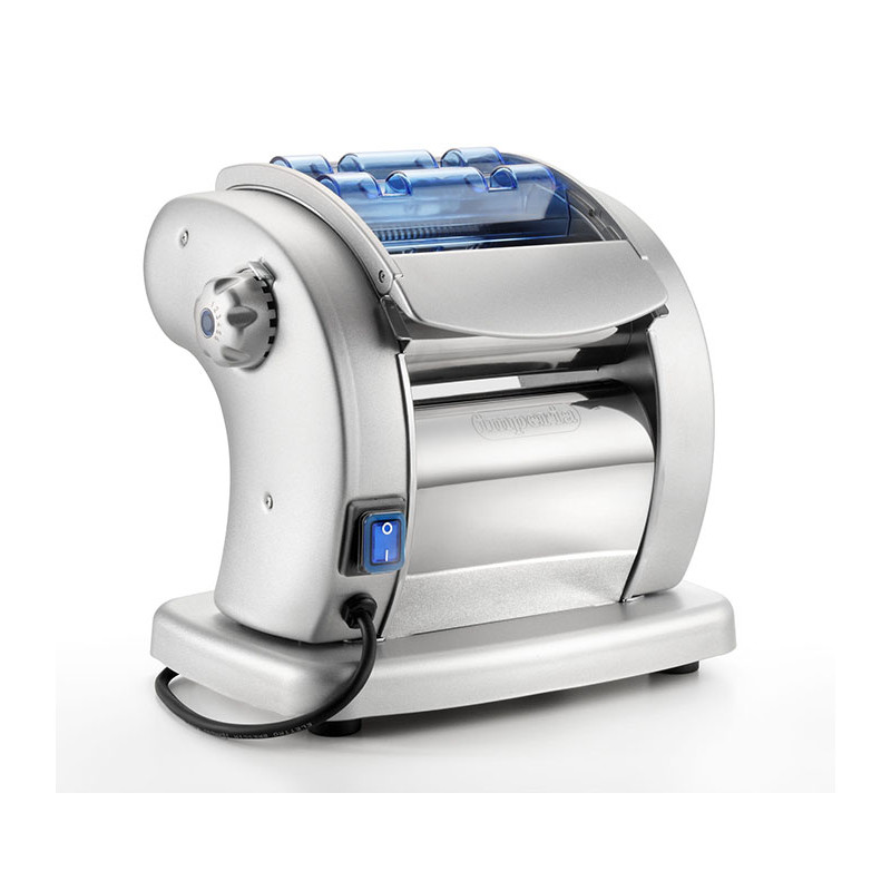 Machine à pâtes électrique pour le laminage de la pâte et la fabrication de tagliatelles 2mm et fettuccine 6,5mm Machine compacte en acier chromé avec laminoirs intégrés Largeur du cylindre : 140 mm 6 épaisseurs d\'abaisse possibles (max 3mm) Peut recevoir les cylindres pour vermicelle, spaghetti, trenette et raviolis en mode manuel avec manivelle fournie Machine stable sur pieds caoutchouc Adaptée à un usage régulier mais non intensif