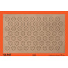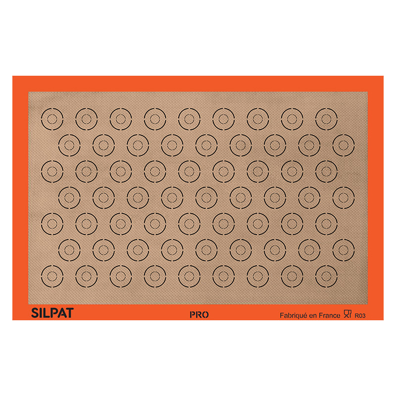 Toile souple pour cuisson sur plaque de pâtisseries, viennoiseries et travail du sucre ou nougatine Utilisable avec tous types de fours Utilisable aussi bien sur une plaque de cuisson perforée que sur une grille Durée de vie conséquente : jusqu\'à 2000 cuissons Nettoyage facile à l\'éponge Fabriqué en tricot de verre imprégné de silicone N\'a pas besoin d\'être graissée Ne doit pas être pliée (à ranger à plat ou rouler) et ne pas couper directement sur la toile Cercles de 15 et 35mm Avec marquage pour le dressage régulier de 63 macarons