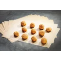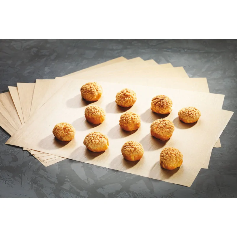 Papier cuisson naturel non-blanchi, non opaque, traité au silicone sur les deux faces Utilisable jusqu\'à 2 fois selon le mode de cuisson Présente une excellente stabilité à la chaleur Pour cuire, décorer, stocker ou superposer Conçu pour les processus de cuisson moins exigeants, comme le pain ou les brioches à faible teneur en sucre Fabriqué à partir de fibres vierges d\'une grande pureté chimique Feuilles antiadhérentes Papier de cuisson respectueux de l\'environnement Grammage : 39 g/m2