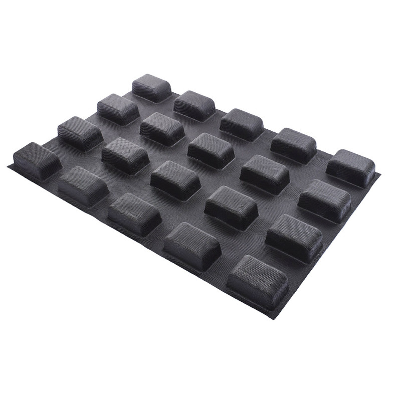 Forme en tricot de verre recouvert de plusieurs couches de silicone Avantages du système Flexipan : souplesse, maintien et anti-adhérence Démoulage facile sans graissage au préalable Compatible avec tous types de four Cuisson et coloration homogène 2000 à 3000 cuissons par moule suivant les références Facile à nettoyer (il suffit de le tremper dans l\'eau chaude après utilisation) Format de plaque adapté à la production en série Utilisable en cuisson comme en surgélation de -40° à +260°C