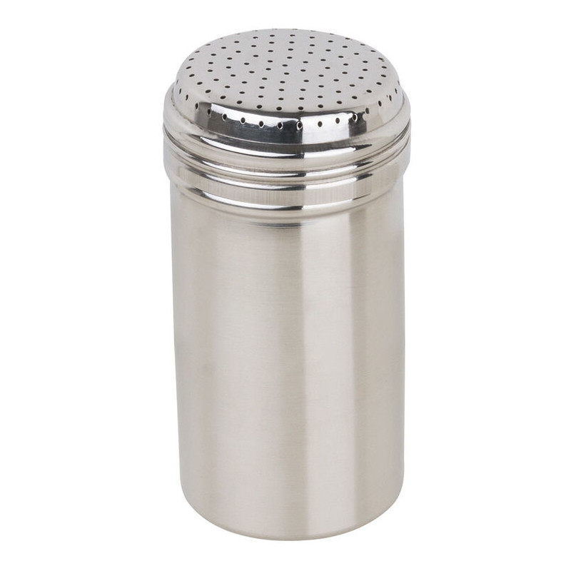 En acier inoxydable (la cascade, la vis sans fin et la carrosserie) Perforations : 1,5mm Idéal car couvercle vissant est perforé, ainsi que les bords pour un saupoudrage précis