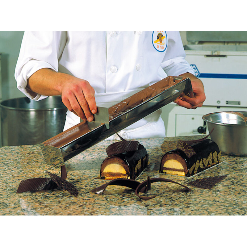 En acier inoxydable Forme spécialement adaptée aux gouttières rondes et très pratique Simplifie la fabrication des bûches 2 parfums à base de mousse ou de glace Permet d\'étaler et de lisser le premier parfum de façon régulière et homogène dans le moule Ensuite de remplir l\'espace restant avec le 2ème parfum en lissant à la spatule Obtention d\'une bûche d\'une présentation impeccable à la coupe