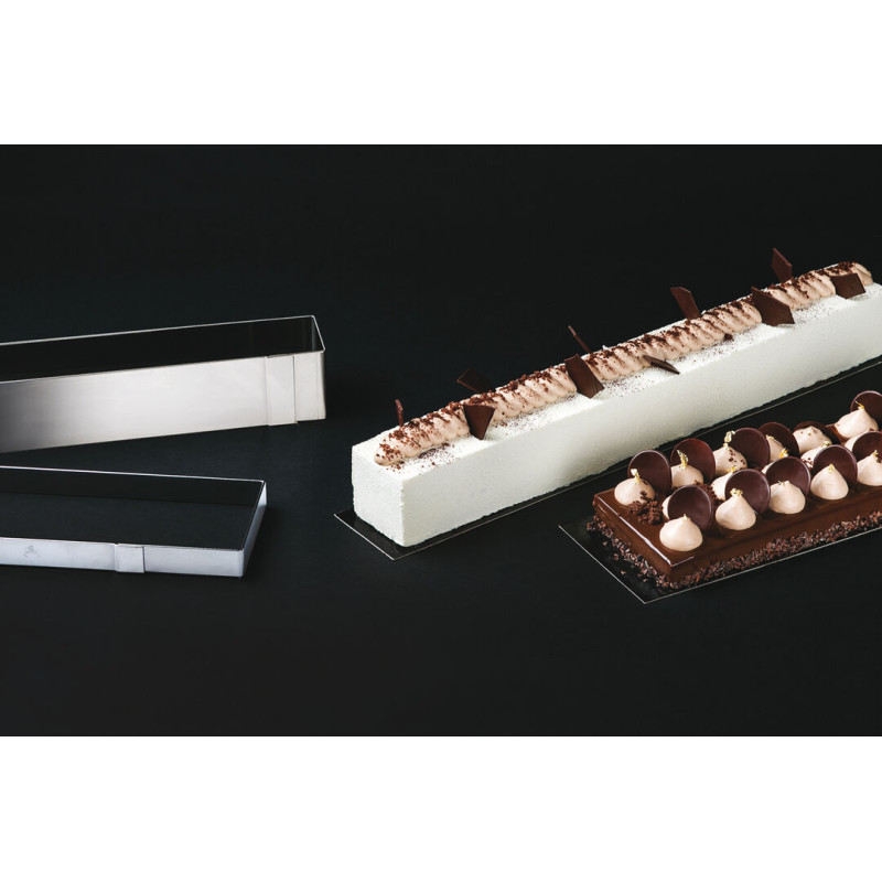 En acier inoxydable Spécialement conçu pour le montage de bûches ou d\'entremets Permet un démontage plus simple et son format permet d\'optimiser le stockage sur plaques pâtissières