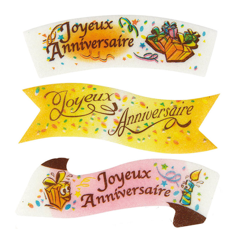 boîte de 24 décors en pain azyme banderole Joyeux anniversaire aromatisé à la vanille, 3 modèles assortis 94x32 mm