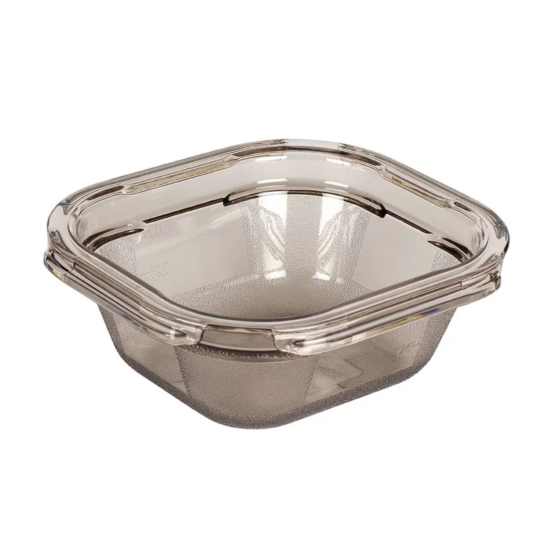 Matériau recyclable 100% : copolyester Adapté à la liaison froide, la congélation, la remise en température et au four micro-ondes Transparent : identification rapide du contenu Emboîtable à vide Couvercle en creux pour l\'empilabilité Conforme à la norme EN631-1 Forme étudiée pour un séchage rapide et un bon égouttage Epais et très robuste Coins arrondis ultra-résistants