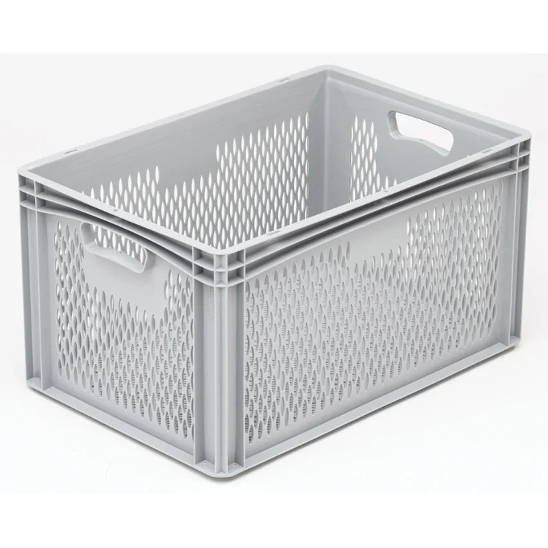En polypropylène Bac gerbable plein de couleur grise, avec poignées ouvertes Bac adapté au contact alimentaire compatible avec le stockage sur palette ou sur chariot de transport