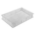 En polyéthylène Adapté au contact alimentaire et gerbable Bac ajouré compatible avec le stockage sur palette ou pour les manipulations sur chariots à roulettes Fond et côtés ajourés Poignées pleines Compatible avec le couvercle 149106