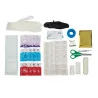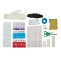 Adapté pour les entreprises de moins de 12 personnes De grande qualité et complet 1 couverture de survie isolante (2,20x1,40m) + 1 doigtier en cuir + 1 pansement compressif 10x10cm 1 pince à écharde inox + 1 bande extensible maille élastique 5cm x 3m 1 bande extensible maille élastique 7cm x3m + 4 lingettes désinfectantes et bactéricides 4 lingettes asséchantes + 4 lingettes apaisantes + 1 paire de ciseaux inox + 1 sparadrap tissu 2,5 cm x5m 1 paire de gants + 18 pansements urgo 3 tailles + 10 compresses stériles 20x20 + notice 1er secours