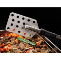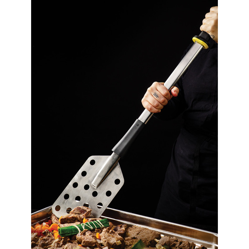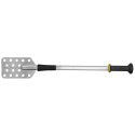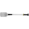 Gamme ergonomique. Ameliore le confort des opérateurs, réduit la pénibilité et limite les risques de TMS Position du corps de l\'outil verticale et adaptée. Le poignet reste dans l\'alignement de l\'avant-bras Plusieurs prises en main possibles pour une meilleure gestion de l\'effort Outil suspendu par son pommeau. Support code 111205 Poignée pagaie Exoglass® munie d\'une butée pour maximiser la restitution de l\'effort. Résiste à 220°C Fixation renforcée des poignées pour éviter la casse Tube oblong en acier inoxydable évite le roulement sur les bords des cuves Choqueur en tête d\'outil pour limiter le bruit, les vibrations et protéger les bords de cuves Palette inox conçue pour racler efficacement le fond des cuves Dimensions de la palette : 230 mm Largeur palette : 140 mm En acier inoxydable et Exoglass