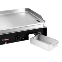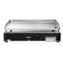 Nouvelle plaque en acier inoxydable emboutie de forte épaisseur pour une diffusion optimale de la chaleur Angles rayonnés de la plaque facilitant l\'entretien 2 zones de cuisson avec 2 brûleurs indépendants de 2900W chacun pour usage intensif Thermostats réglables jusqu\'à 300°C Régulation automatique de la température de la plaque Allumage par train d\'étincelles intégré aux manettes de gaz Grande surface de cuisson : 64 x 44cm Chassis tout inox équipé de 4 pieds à vérin réglable Tiroir de récupération des résidus de cuisson de grande capacité (1,3L) avec filtre intégré, lavable au lave-vaisselle Alimentation gaz butane ou propane (kit connexion non fourni) Kit d\'adaptation pour utilisation avec le gaz naturel fourni