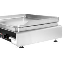 Nouvelle plaque en acier inoxydable emboutie de forte épaisseur pour une diffusion optimale de la chaleur Angles rayonnés de la plaque facilitant l\'entretien 2 zones de cuisson avec 2 brûleurs indépendants de 2900W chacun pour usage intensif Thermostats réglables jusqu\'à 300°C Régulation automatique de la température de la plaque Allumage par train d\'étincelles intégré aux manettes de gaz Grande surface de cuisson : 64 x 44cm Chassis tout inox équipé de 4 pieds à vérin réglable Tiroir de récupération des résidus de cuisson de grande capacité (1,3L) avec filtre intégré, lavable au lave-vaisselle Alimentation gaz butane ou propane (kit connexion non fourni) Kit d\'adaptation pour utilisation avec le gaz naturel fourni
