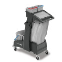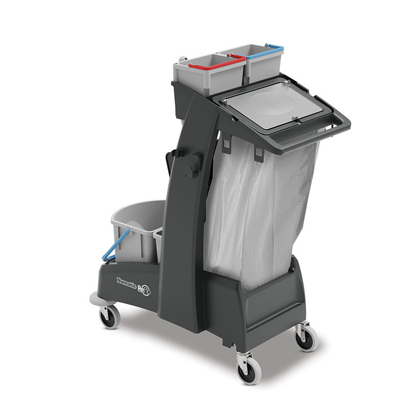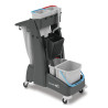 En polypropylène Chariot de ménage pour professionnels, compact et pratique Avec embase, équipé d\'une presse universelle, d\'un seau frontal de 17 L, d\'un seau arrière de 15 L et de deux seaux pivotants 5L Embarque un collecteur de déchets avec support pour sac poubelle de 70L Plateau de rangement superieur comprenant deux seaux de 5 litres Deux grands crochets à fente en T, deux clips pour balai, deux supports balai Equipé de roulettes multidirectionnelles Chariot livré à plat en kit à monter