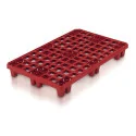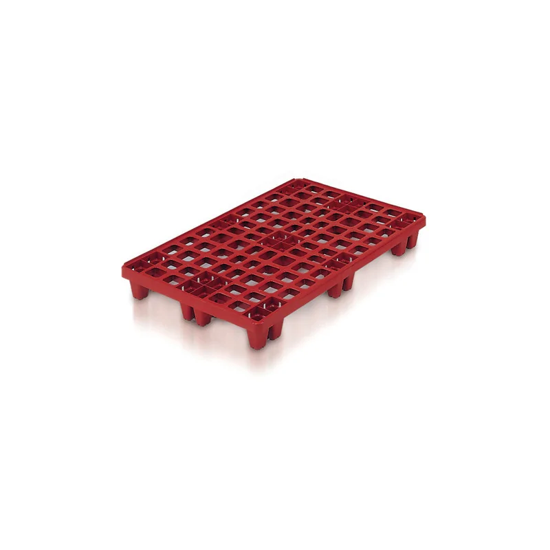 En polyéthylène haute densité, coloris brun Palette de stockage Packpal munie de 9 plots Peut être utilisée comme support de stockage au sol en chambre froide/congélateur/laboratoire Avec plancher supérieur ajouré muni d\'un rebord Charge statique : 1,5 tonne. Charge dynamique : 650kg