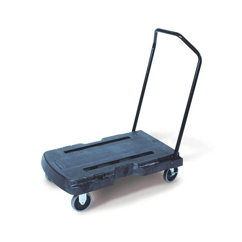 En polyéthylène Chariot à poignée très résistant, indéformable et ne craint pas la rouille Plateau du chariot large et stable, poignée avec 3 positions (inclinée, droite ou pliée) 4 roues larges pour une meilleure stabilité. Roues spéciales anti-traces. 2 roues lisses, 2 pivotantes Plateau spécial anti-dérapant peut servir de socle à roulettes lorsque la poignée est repliée Charge utile : 180 kg