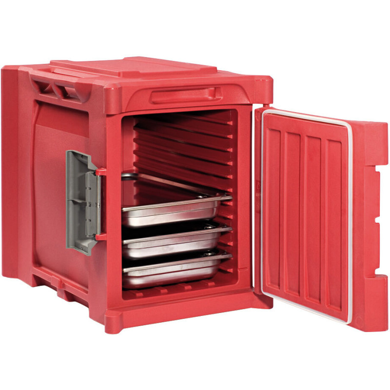Conception en polyéthylène alimentaire Isolation efficace par mousse sans CFC Intérieur avec glissières monobloc, sans zone de rétention d\'eau - Glissières au pas de 36 mm Poignées encastrées ergonomiques Grand loqueteau de fermeture rapide 1 main Coins et bords renforcés - Côtés et dessus rigidifiés Patins anti-usure sur le dessous Formes étudiées pour un bon calage lors de l\'empilage Utilisation en température de -30°C à +85°C Porte, loqueteaux facilement démontables sans outil. Porte sans charnière Fermetures parfaitement étanches. Parfaite circulation de l\'air dans les enceintes Livré avec un jeu d\'étiquettes : rouge (liaison chaude) bleue (liaison froide) Compatibles avec le lavage au jet haute pression Certifié NF Hygiène Alimentaire