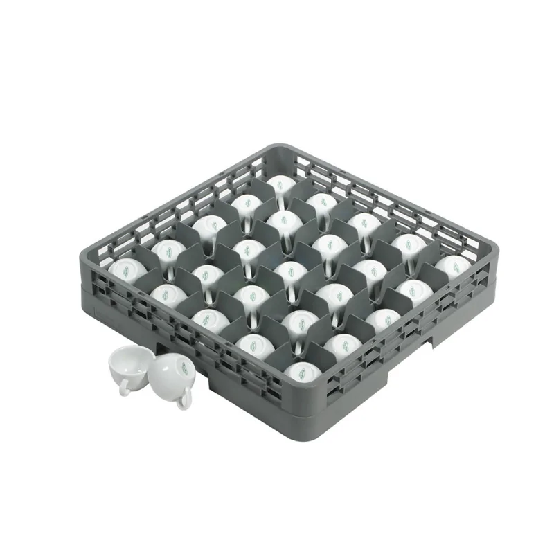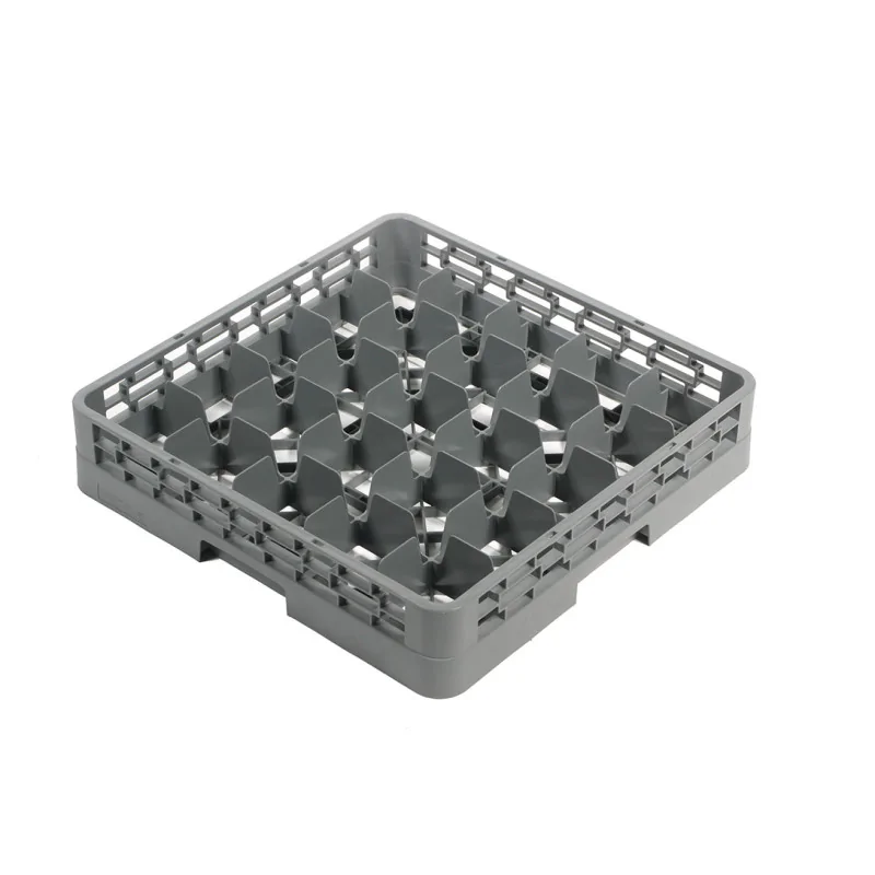 En polypropylène alimentaire Parfaitement compatible avec les machines à entraînement central ou latéral Les dessins du fond et des parois ont été conçus pour permettre une parfaite circulation des eaux de lavage, un séchage optimum et rapide, avec notamment une barrette d\'inclinaison pour verres à pied