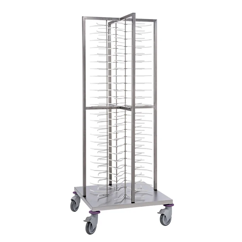 Structure acier inoxydable en croix pour une rigidité parfaite en charge Supports en acier inoxydable avec revêtement adhérent pour sécuriser le maintien des assiettes lors des déplacements Charge maximale par support : 1,5 kg. Diamètres d\'assiettes compatibles : 190 mm à 320 mm Livré démonté avec visserie 4 roues composite Ø 12,5 cm - 2 avec freins - Tenue en température des roues : -20°C à +60°C