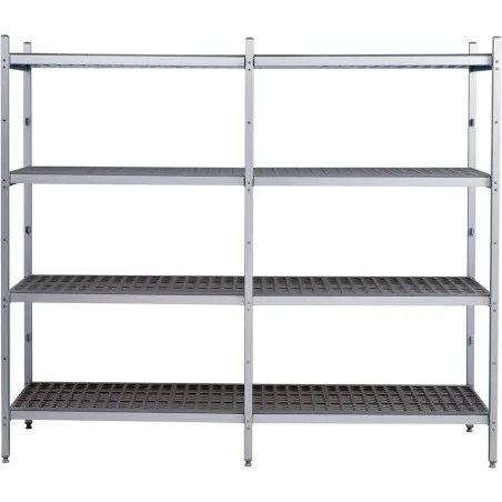 Montage facile : sans aucun outil, par simple emboîtement Ce kit permet de monter une étagère profondeur 42,5 cm avec clayettes en plastique, 4 niveaux espacés de 480 mm Dimensions du carton : 1 980 x 660 x 110 mm - Poids : 20 kg Facilité de nettoyage Charge maximale : 30 kg par clayette soit 90 kg par niveau