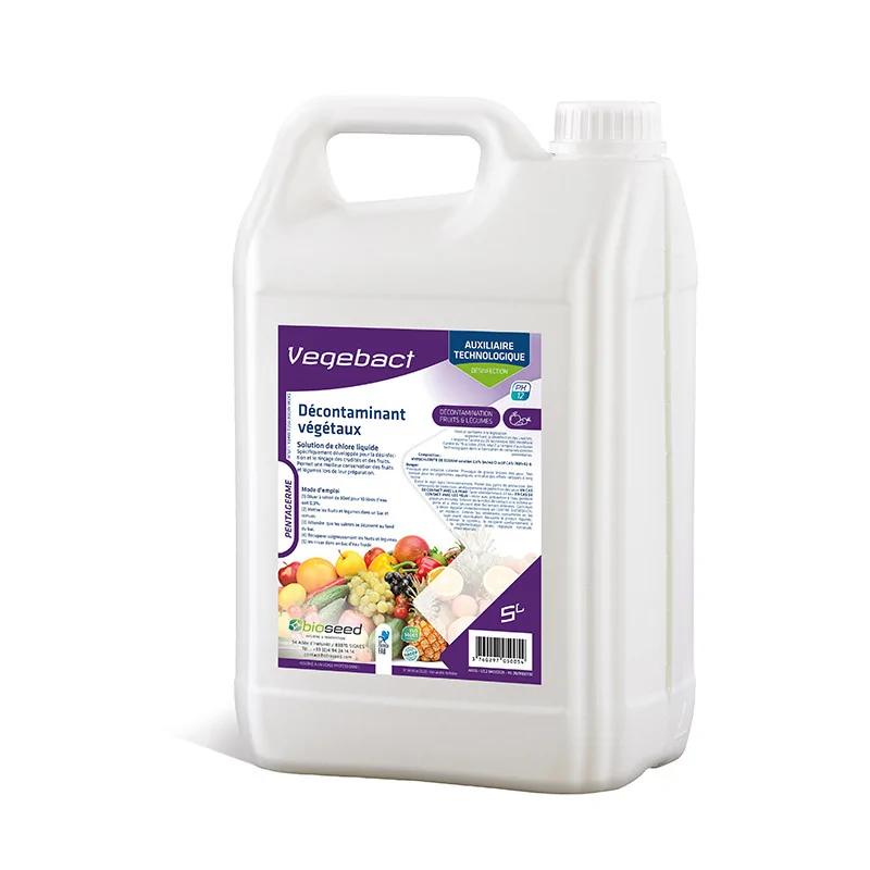 Décontamination des fruits et des légumes Elimine les germes et micro-organismes pathogènes Assure l\'innocuité des préparations végétales à consommer crues Sécurise la production alimentaire Assure une meilleure conservation Idéal dans les cuisines collectives : conforme à l\'arrêt du 27 Juin 2017 modifiant l\'arrêt du 19 Octobre PH : 12 Dilution : 30 ml pour 10 l d\'eau