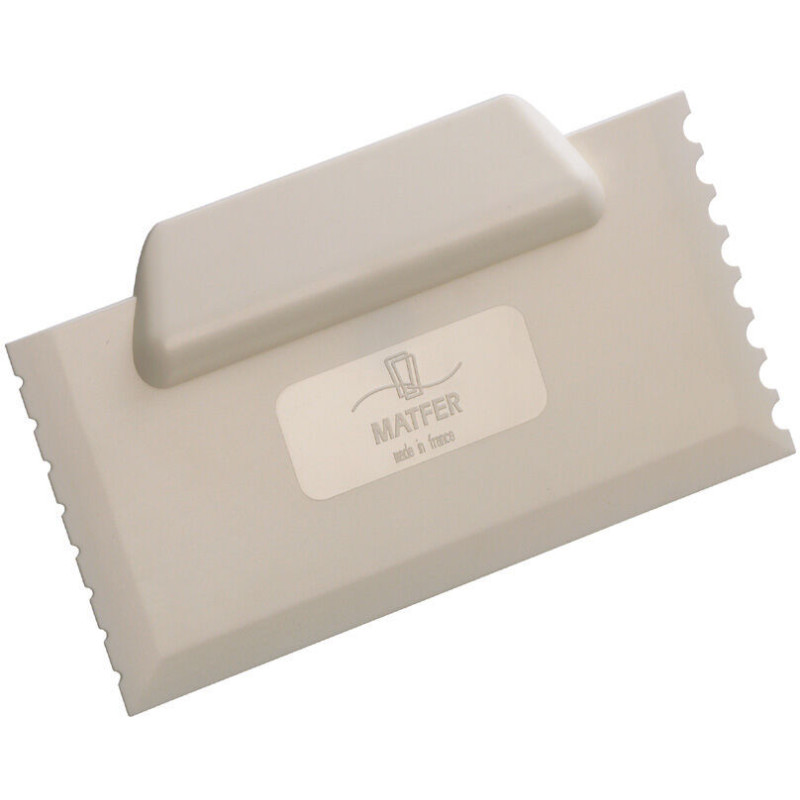 Racloir à chocolat semi-souple en acrylonitrile butadiène styrène (ABS) blanc Sert à racler le chocolat sur la plaque Cool Décor et à peigner pour créer des rayures Possède 3 côtés différents : 1 côté lisse, 1 côté petite cannelure et 1 côté grosse cannelure