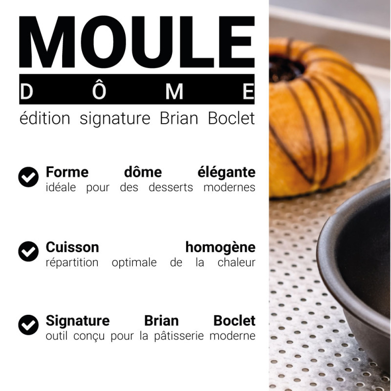 Sa forme demi-sphérique est spécialement pensée pour réaliser les célèbres dômes caramélisés du Chef, de délicieuses petites viennoiseries au goût de marron et de cassis, caramélisées sur le dessus. Polyvalent, il convient également à de nombreuses préparations sucrées ou salées.