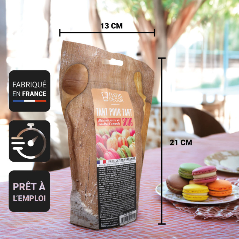 Le tant pour tant Patisdécor est un ingrédient incontournable de la pâtisserie française, spécialement conçu pour la réalisation des coques de macarons. Il s'agit d'un mélange à parts égales de poudre d'amandes blanchies et de sucre glace amylacé, parfaitement dosé pour garantir la texture lisse et moelleuse des macarons.