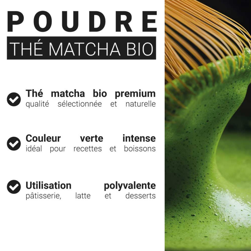Issu de l'agriculture biologique (certifié FR-BIO-01), ce matcha est un produit brut, 100 % naturel, sans aucun additif ni conservateur. Sa texture ultra-fine lui permet de se dissoudre parfaitement dans vos boissons, tout en apportant une couleur verte éclatante à vos pâtisseries, sans avoir recours à des colorants artificiels.