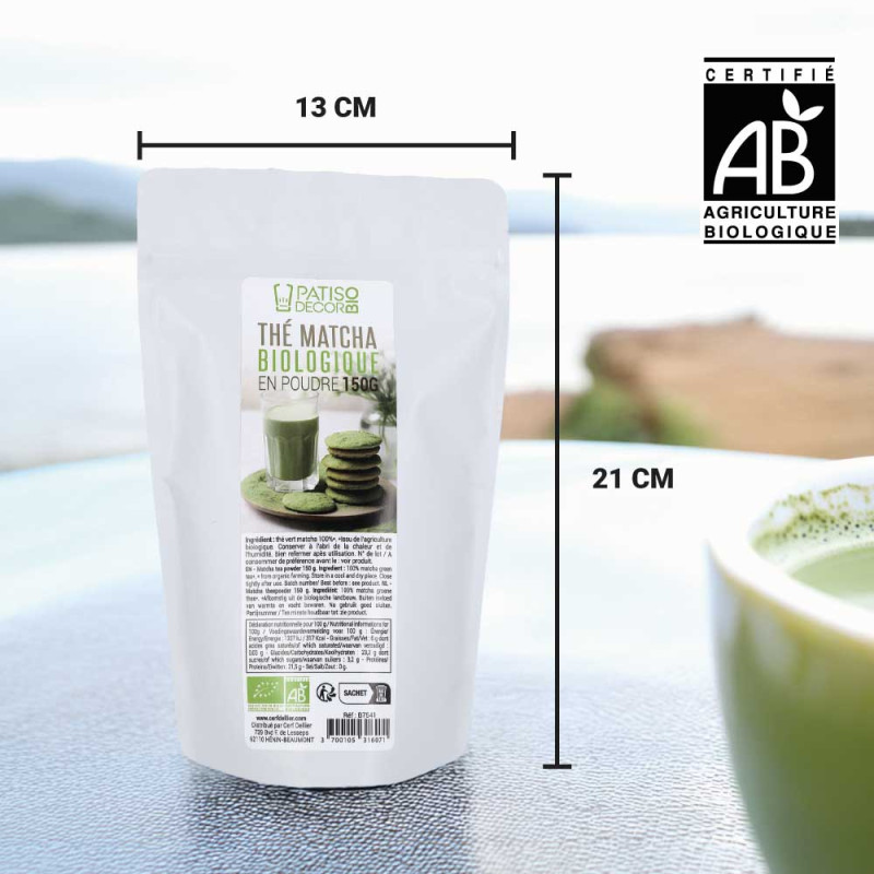 Adoptez la puissance du thé Matcha Bio Patisdécor. Cette poudre fine de haute qualité, originaire du Japon, est parfaite pour vos boissons (Matcha Latte) et vos desserts. Certifié Bio, sans additifs, il offre une couleur verte naturelle et un goût végétal unique. Format 150 g en sachet zippé.